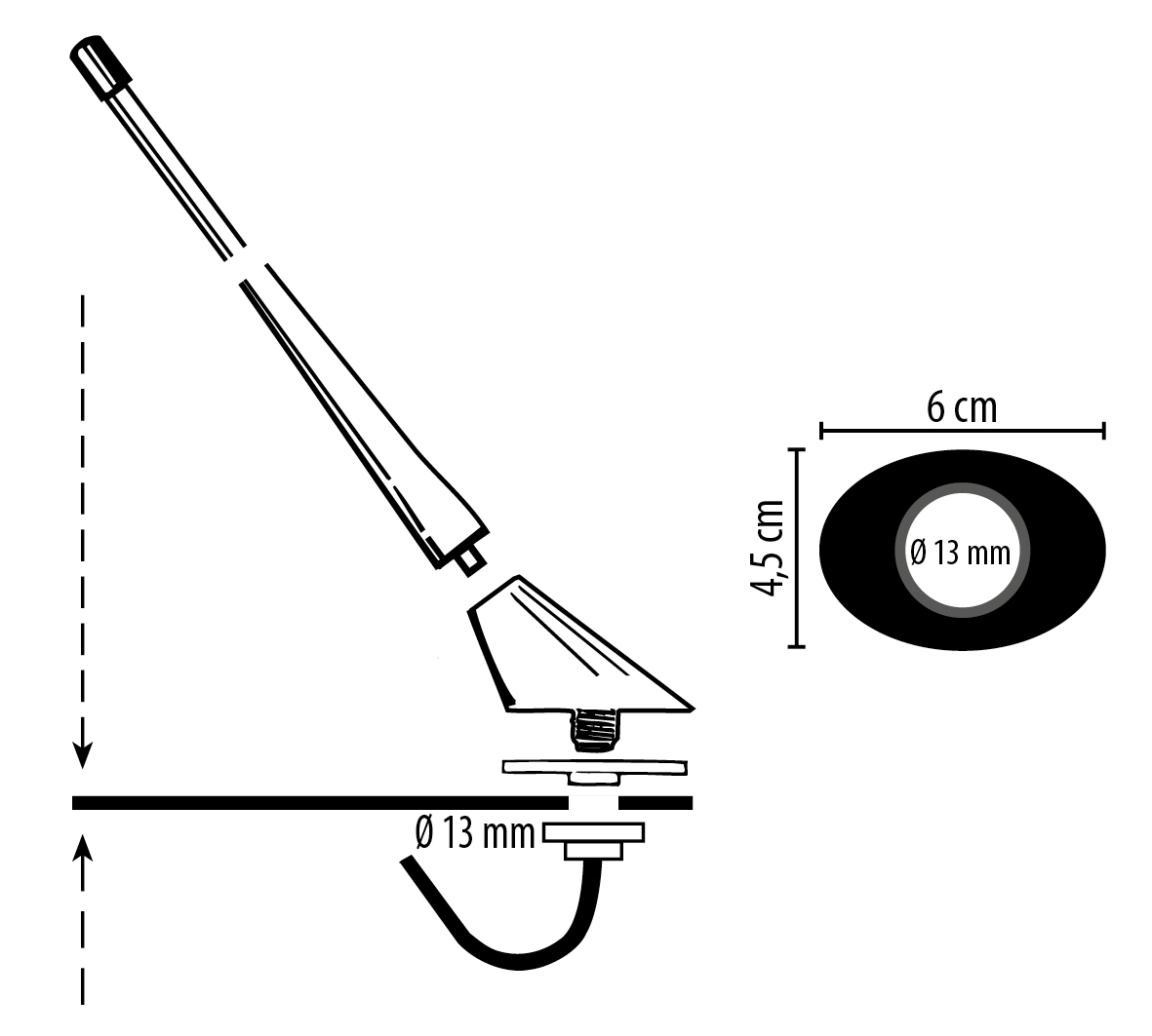 Prima di installare l’antenna verificare che il foro per il fissaggio sul tetto dell’auto sia di 13 mm e che la misura della base dell’antenna originale sia uguale o inferiore 4,5×6 cm.