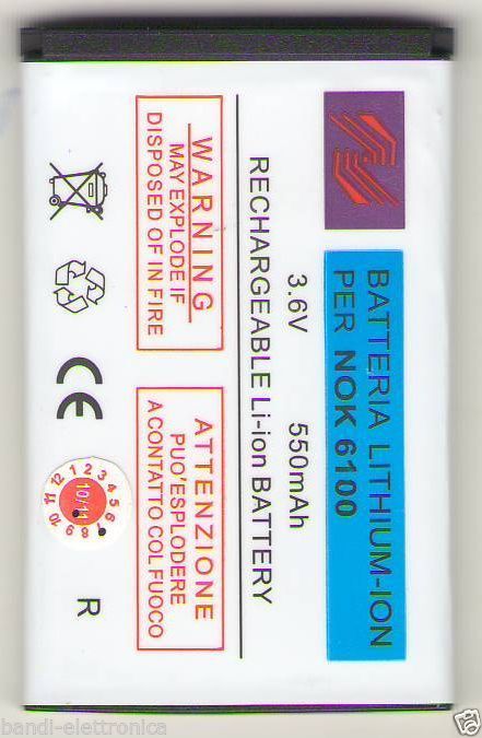 BATTERIA COMPATIBILE (NON ORIGINALE)Nokia: 1100, 1101, 1108, 1110, 1110i, 1112, 1200, 1208, 1209, 1255, 1315, 1600, 1616, 1650, 1662, 2112, 2118, 2220 Slide, 2255, 2272, 2275, 2300, 2310, 2323 Classic, 2330 Classic, 2355, 2600, 2610, 2626, 2650, 2652, 2690, 2710 Navigation Edition, 2730 Classic, 3100, 3105, 3109 Classic, 3110 Classic, 3110 Evolve, 3120, 3125, 3500 Classic, 3610 Fold, 3650, 3660, 5100, 5130 XpressMusic, 6030, 6085, 6086, 6100, 6101, 6103, 6108, 6124 Classic, 6125, 6131, 6136, 6170, 6175i, 6178i, 6230, 6230i, 6267, 6270, 6300, 6301, 6555, 6600, 6630, 6631, 6670, 6680, 6681, 6682, 6820, 6822, 7270, 7600, 7610, C1-01, C2-01, E50, E60, N70, N71, N72, N91, X2-00 ATTENZIONE!A VOLTE VERIFICHIAMO IL FUNZIONAMENTO DELLA BATTERIA PRIMA DELLA SPEDIZIONE ,PERCIO’ LA CONFEZIONE TERMOSALDATA POTREBBE RISULTARE APERTA. DISPONIBILI MOLTI ALTRI MODELLI E MARCHE DI BATTERIE,CARICABATTERIE CASA E VIAGGIO,AURICOLARI E ALTRI ACCESSORI DEDICATI .NON ESITATE A CONTATTARCI PER CONOSCERE LA DISPONIBILITA’.