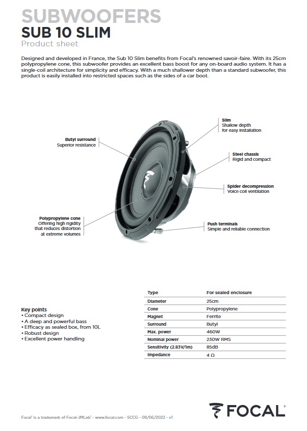 Progettato e sviluppato in Francia, il Sub 10 Slim beneficia del savoir-faire sonoro di Focal.