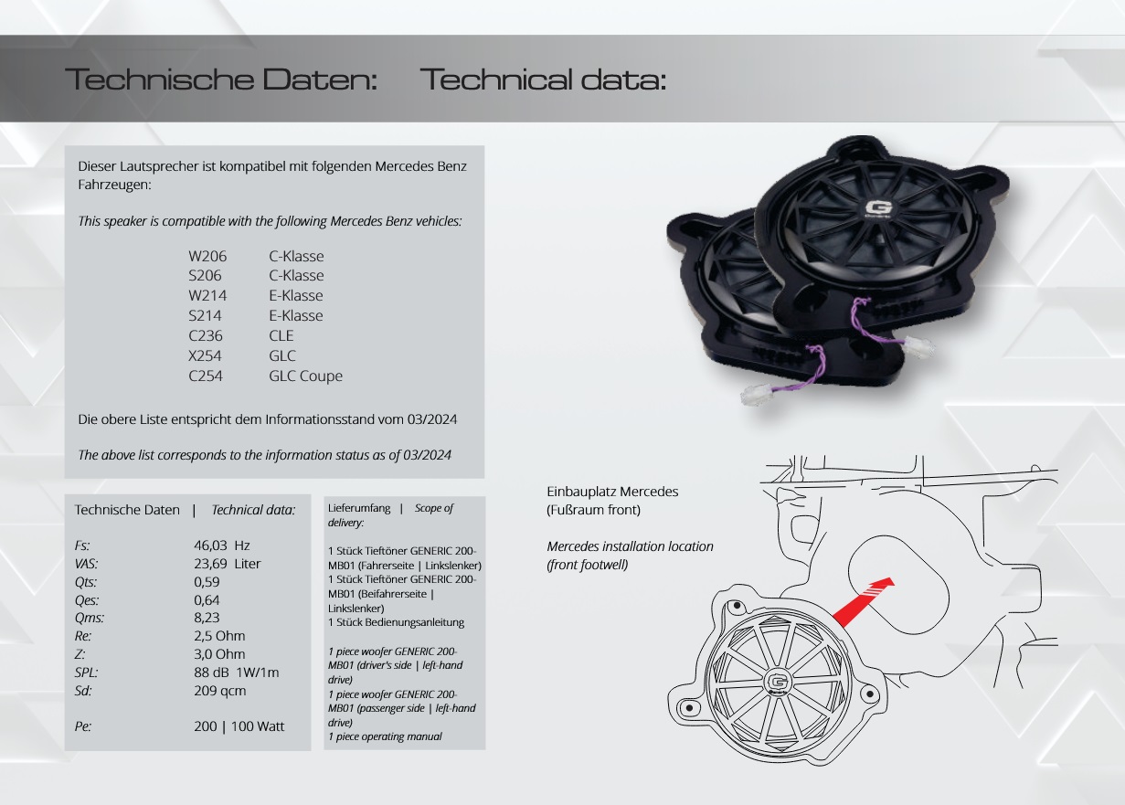 The Gladen GENERIC 200 – MB01 is a vehicle-specific woofer that has been specially developed for applications in the front area of various vehicles.