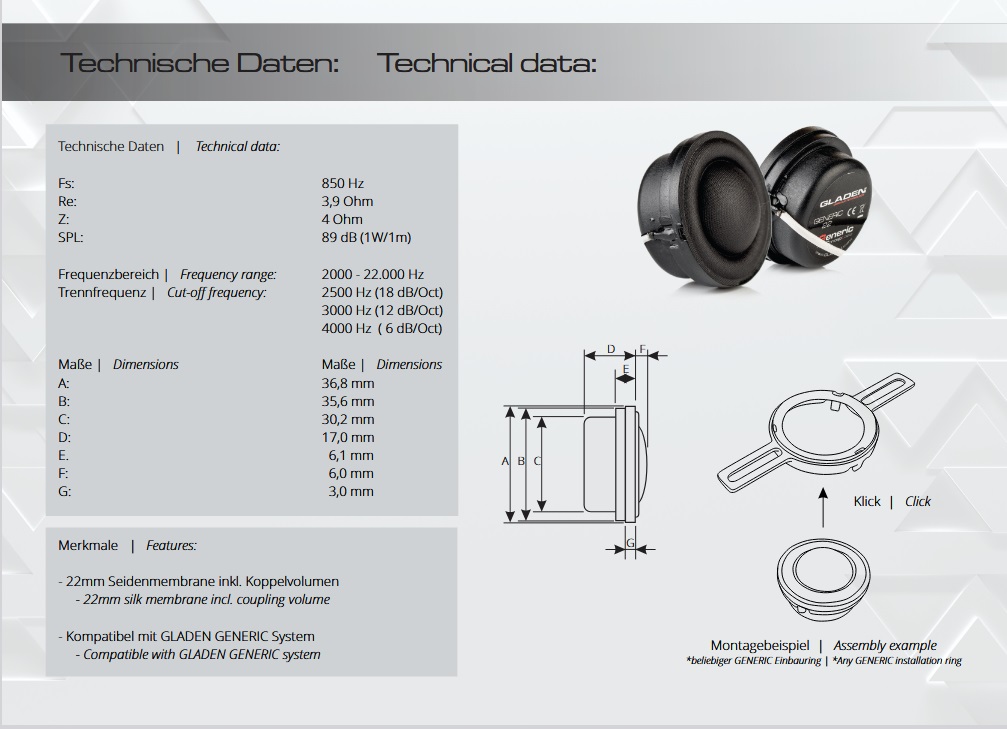 The Gladen GA-GENERIC 22 is a high quality tweeter in a compact design. Its optimum application is in 2-way to 4-way systems.