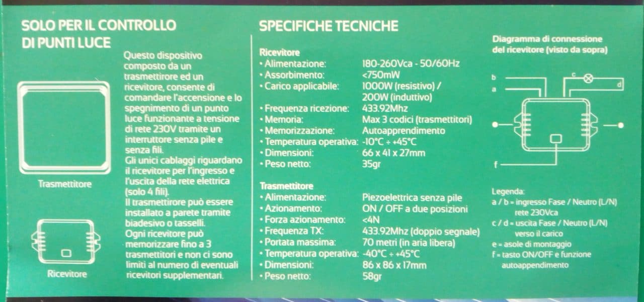 Questo dispositivo composto da un trasmettitore ed un ricevitore, consente di comandare l’accensione e lo spegnimento di un punto luce funzionante a tensione di rete 230V tramite un interruttore senza pile e senza fili.
