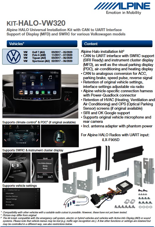 ¹ Il kit non è compatibile con il sistema di chiamata di emergenza, i veicoli elettrici o ibridi e i veicoli con Active Info Display (AID) o impianti audio. Si prega di notare che i menu del veicolo potrebbero andare persi (ad es. riconoscimento dei segnali stradali, ecc.). Alcune altre funzioni o impostazioni vengono mantenute, ma potrebbero essere controllate in modo diverso.
