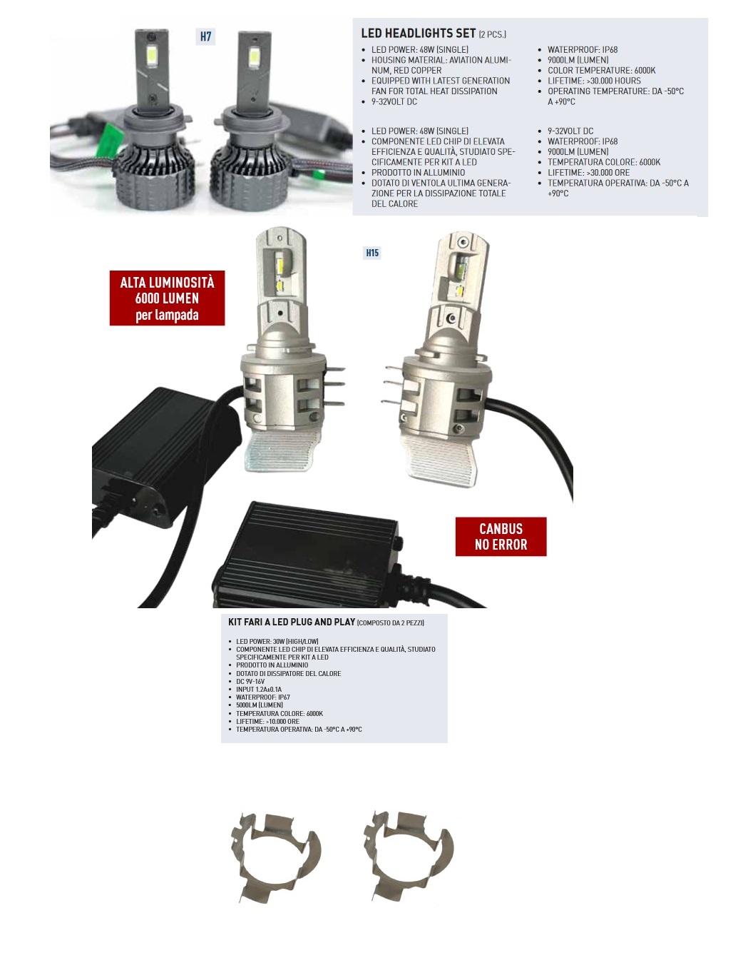 Molto più luminose delle convenzionali lampadine alogene, producono fino a 9000 Lumen per lampadina (18000LM/Coppia) e inoltre la luce è di colore bianco ghiaccio come le luci allo Xeno (6000k). Impermeabile IP68, adatto a condizioni di -50℃ ~ +90℃