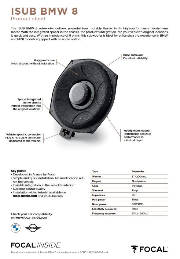 Subwoofer ISUB BMW 8 è un subwoofer che offre bassi potenti grazie al suo motore al neodimio, una tecnologia Focal ad alte prestazioni.