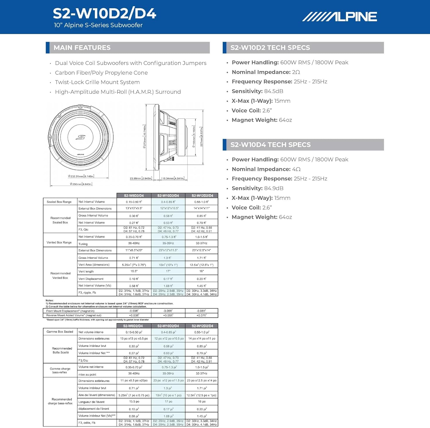 Il subwoofer S2-W10D4 da 25 cm (10″) è in grado di gestire fino a 600 Watt RMS, in modo da poterlo pilotare senza problemi. Il cono riprogettato combina fibra di carbonio e polipropilene per garantire leggerezza e robustezza, mentre il bordo in gomma HAMR (High Amplitude Multi-Roll) consente la massima escursione per prestazioni impressionanti. I pratici ponticelli consentono di passare facilmente dall’impedenza di 2 Ω a quella di 8 Ω per adattarsi al sistema. Questo subwoofer è adatto sia ai diffusori con condotto che a quelli sigillati, in modo che possiate godervi i vostri bassi grandi e rimbombanti o stretti e precisi.
