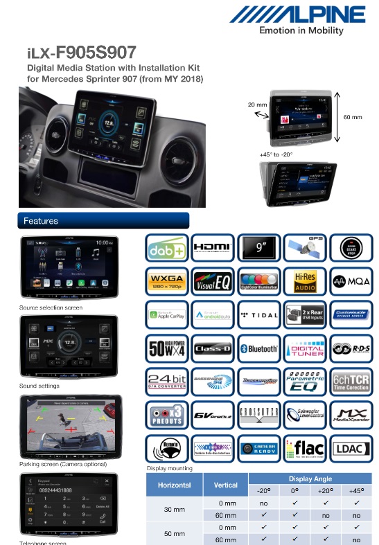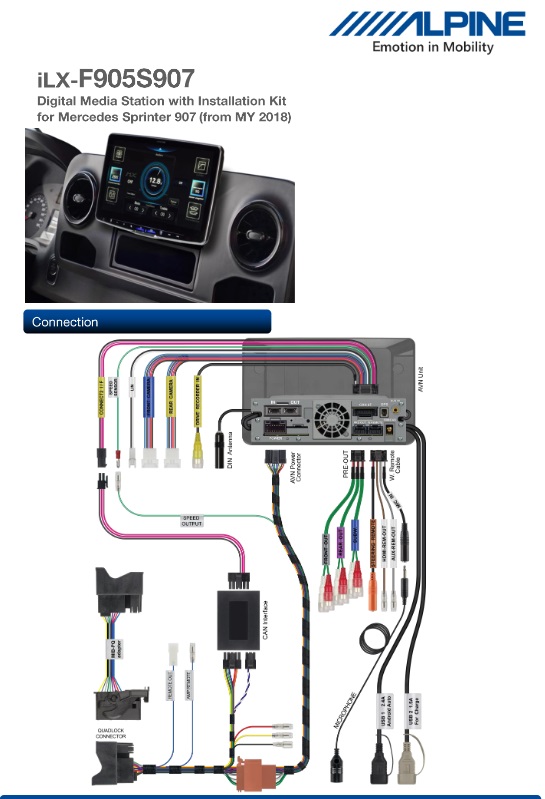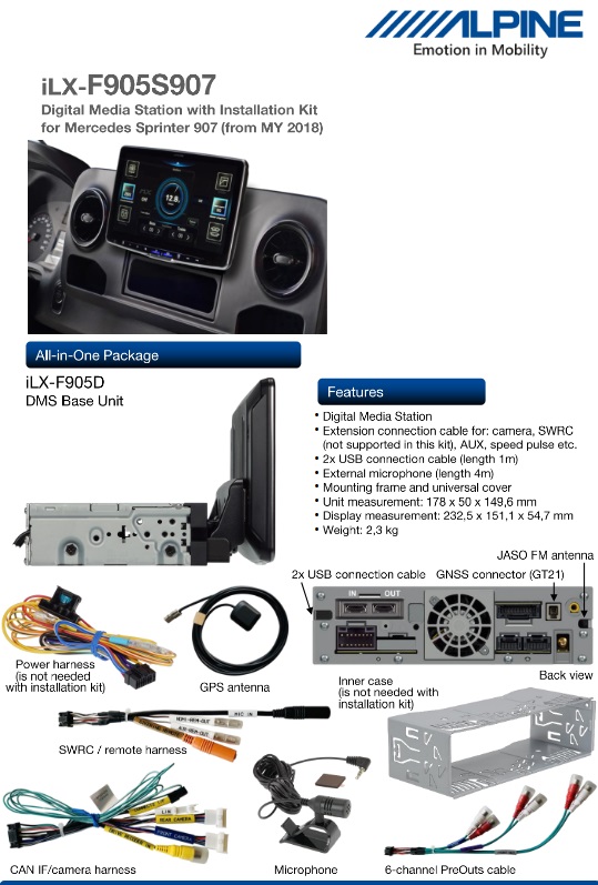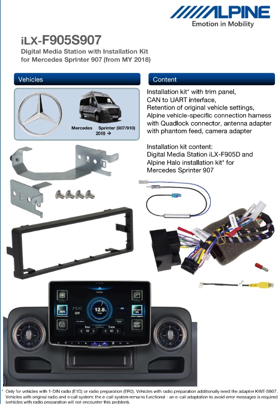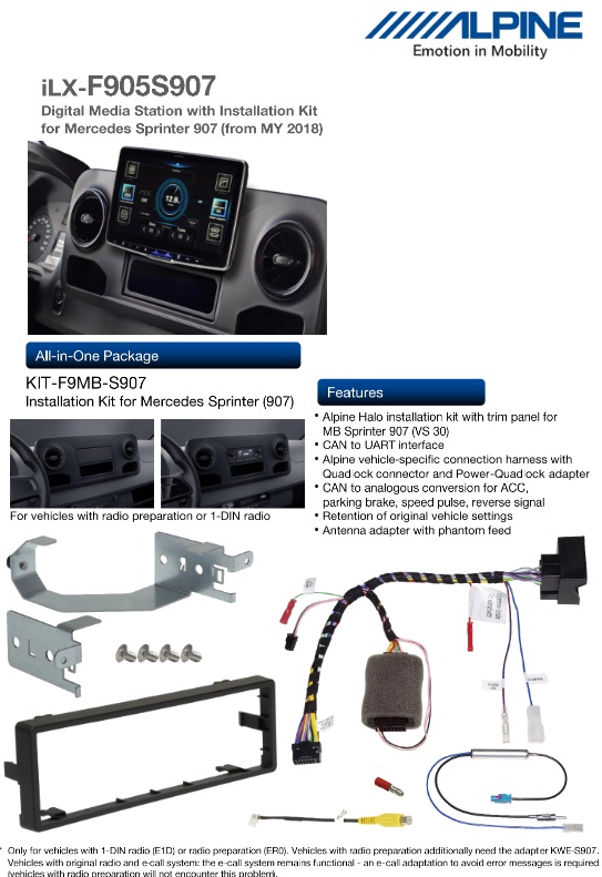 Questo kit di installazione consente di installare senza problemi un Alpine Halo9 in un MB Sprinter dell’anno di modello 2018 e successivi.