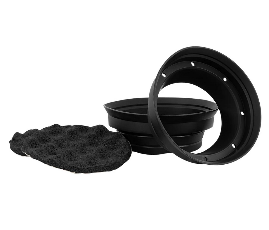 is a pair of universal speaker baffle kits in flexible silicon rubber for 6.5 inch speakers. This is a solution for those wanting to weatherproof their car speakers and prevent water and moisture from damaging them. Sound enhancing foam is included for mounting behind the speaker for better audio quality.
