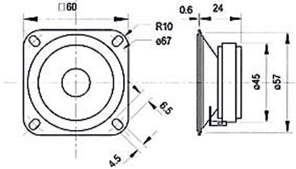 Potenza nominale: 60W, Potenza massima: 100W, Impedenza Z: 8Ω, Tipo Chassis: Toni alti, Risposta di frequenza: 1000 – 30000 Hz, Livello medio pressione sonora: 91dB, Limite escursione +/-: 0,5mm, Frequenza di risonanza fs: 1,5KHz, larghezza: 6cm, lunghezza: 6cm, profondità: 2,7cm, Diametro membrana: 60mm, Diametro tra i fori: 66,5mm, Diametro di montaggio: 5,5cm, Colore: nero